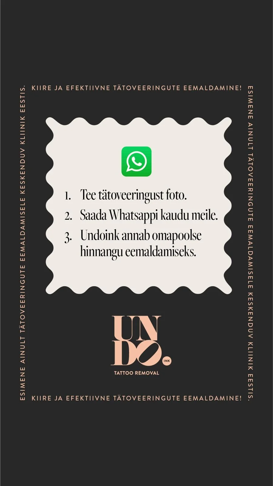 Tee oma tätoveeringust foto ja saada koos kirjeldusega meie Whatsappi numbril või e-posti aadressil. Anname kiire esmase hinnangu, mitu laseri sessiooni võib tätoveeringu täielikuks eemaldamiseks kuluda.